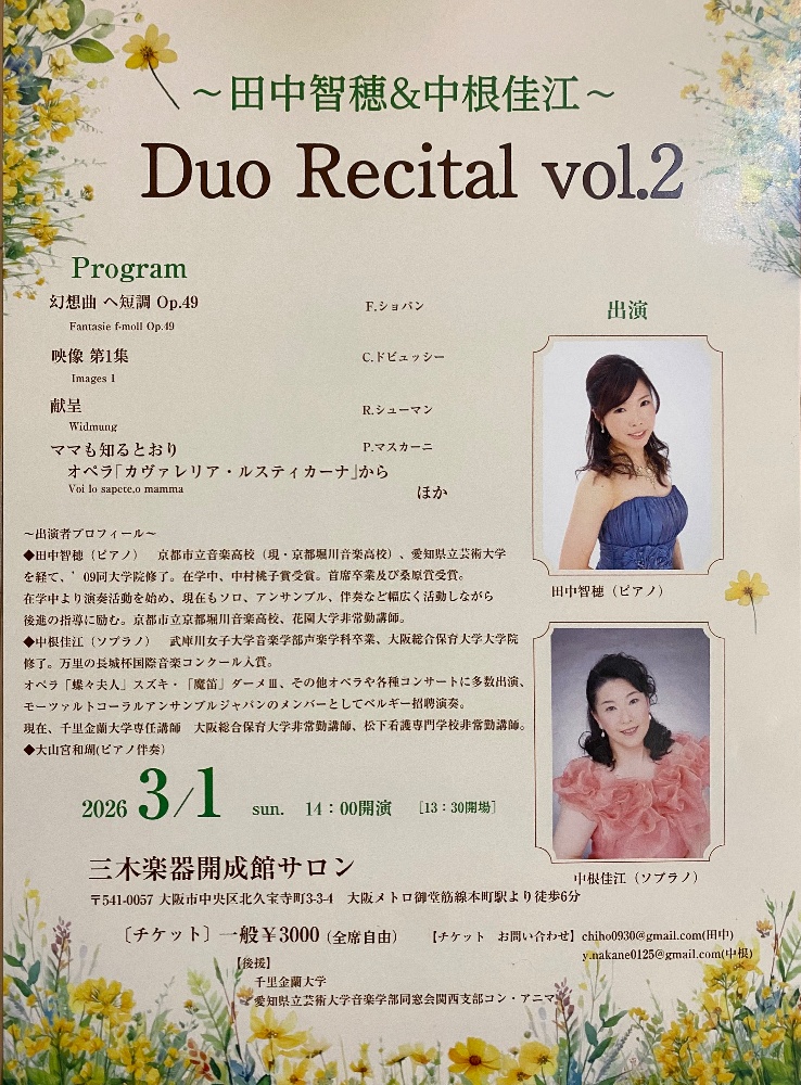 2026年3月1日(日)田中智穂&中根佳江 Duo recital Vol.2を開催します。本町 三木楽器開成館サロンにて。14時開演